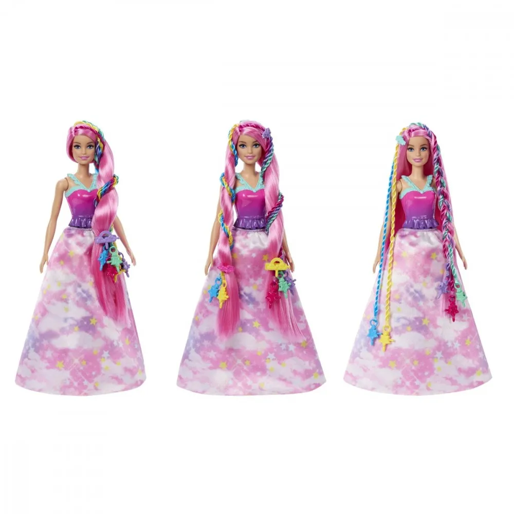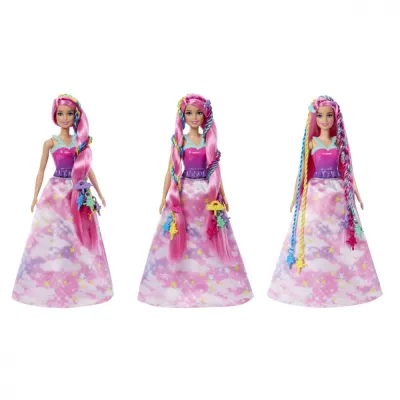 Barbie Dreamtopia Księżniczka ma bardzo długie włosy (21,5 cm) w fantazyjnym kolorze oraz doczepiane, tęczowe pasemka, które można dowolnie stylizować. Dzięki specjalnemu przyrządowi do kręcenia włosów wystarczy tylko włożyć zaczepy i nacisnąć przycisk, aby wyczarować kolorowe loki i zakręcone fryzury! Całość uzupełniają trzy tęczowe klipsy, które pomagają utrzymać fryzurę na miejscu.