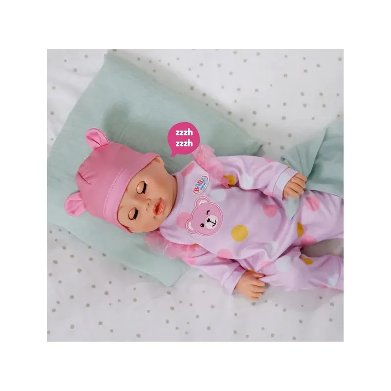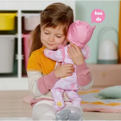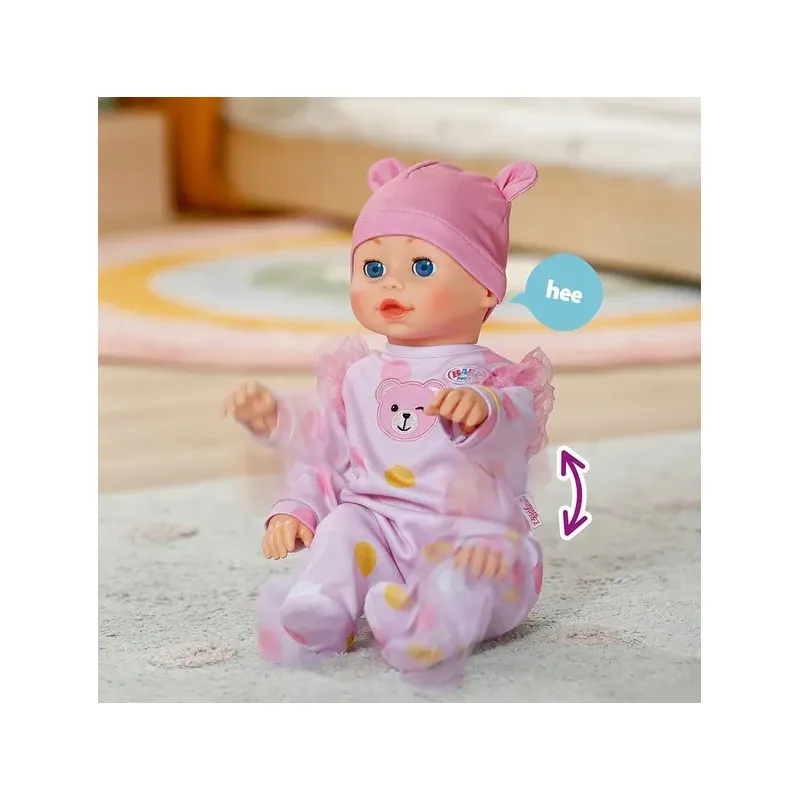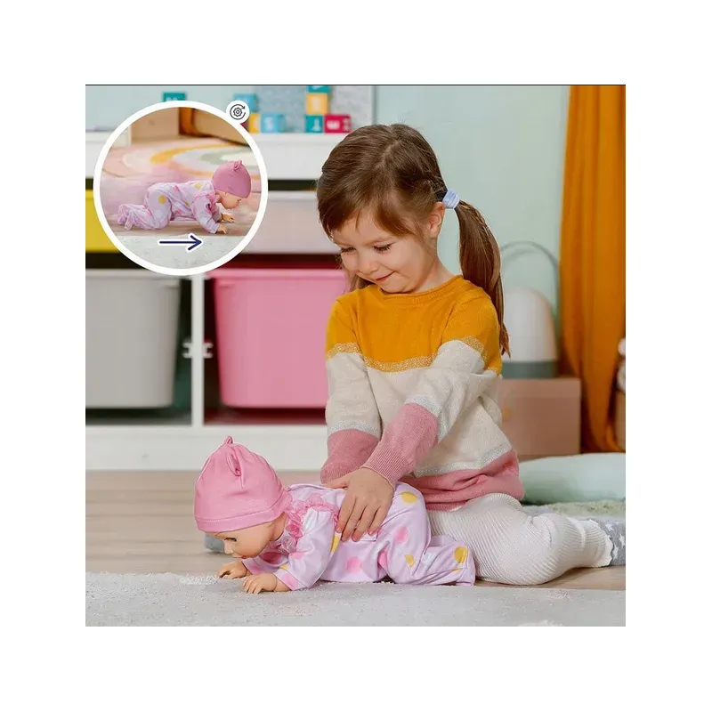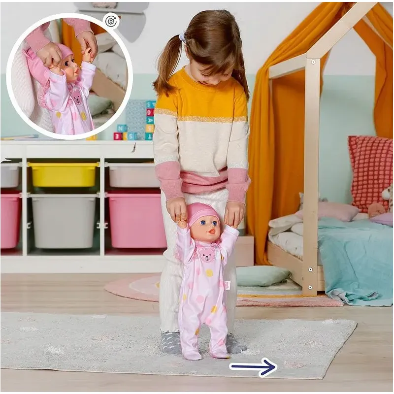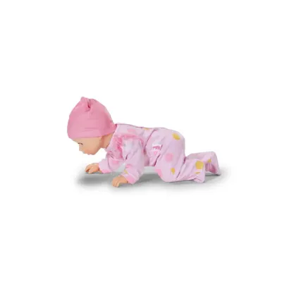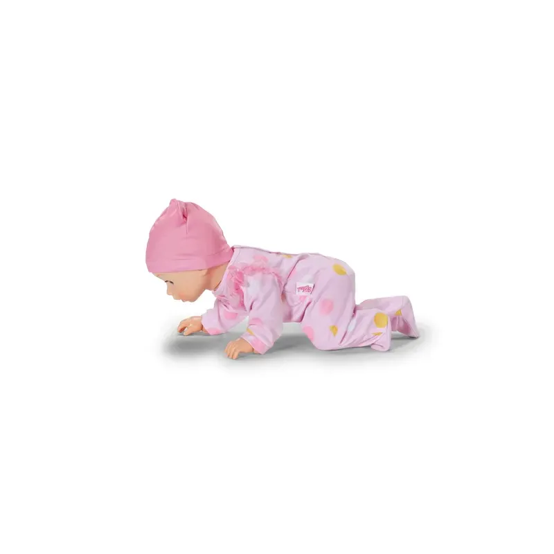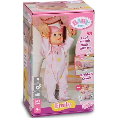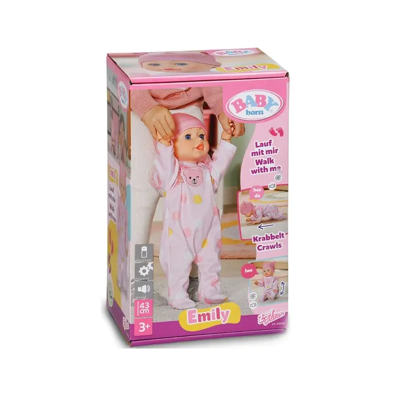 Ta lalka o wysokości ok. 43 cm zachowuje się jak mały bobas – potrafi raczkuje i stawia pierwsze kroki, gdy dziecko chwyci ją za rączki. Emily reaguje na dotyk i ruch, wydając realistyczne dźwięki: gaworzy, śmieje się, płacze i zasypia, gdy ją ukołyszesz. Jej naturalne zachowania oraz miękki różowy kombinezon z czapeczką sprawiają, że zabawa jest jeszcze bardziej realistyczna i emocjonująca.