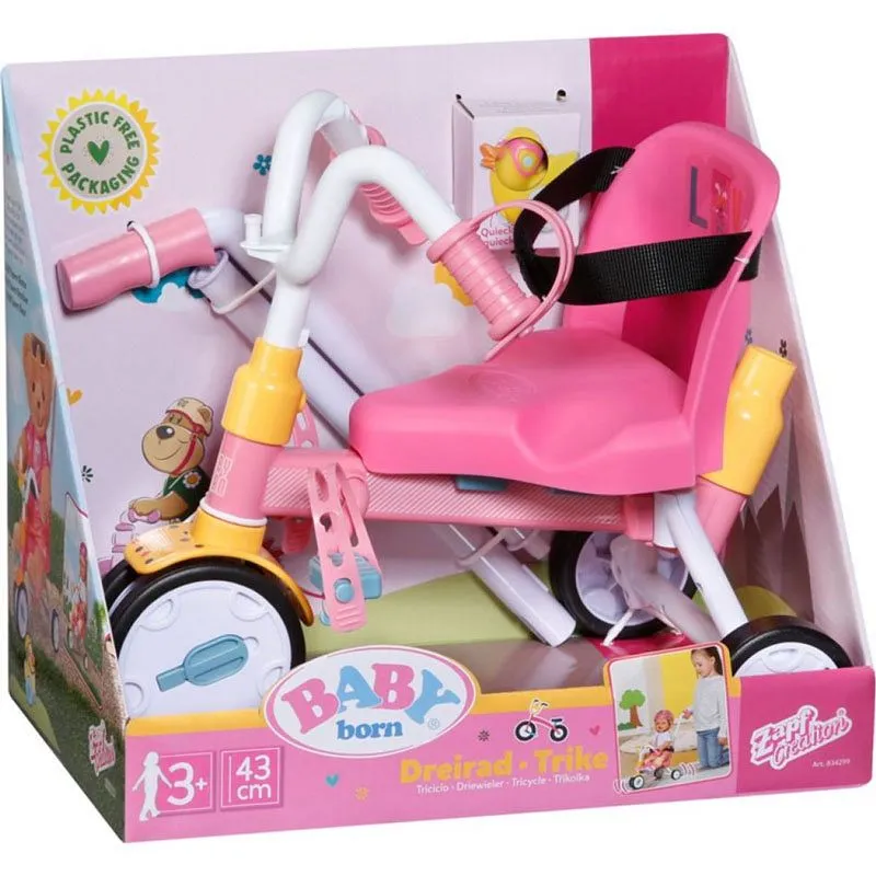 BABY Born Trike Rowerek Trójkołowy 43 cm to realistyczny pojazd dla lalek, który zapewnia aktywną i kreatywną zabawę. Ma ruchome pedały, skrętną kierownicę, klakson oraz pasy i pętle, które stabilnie utrzymują lalkę podczas jazdy. Idealny dodatek do spacerów i zabaw na świeżym powietrzu z BABY Born!