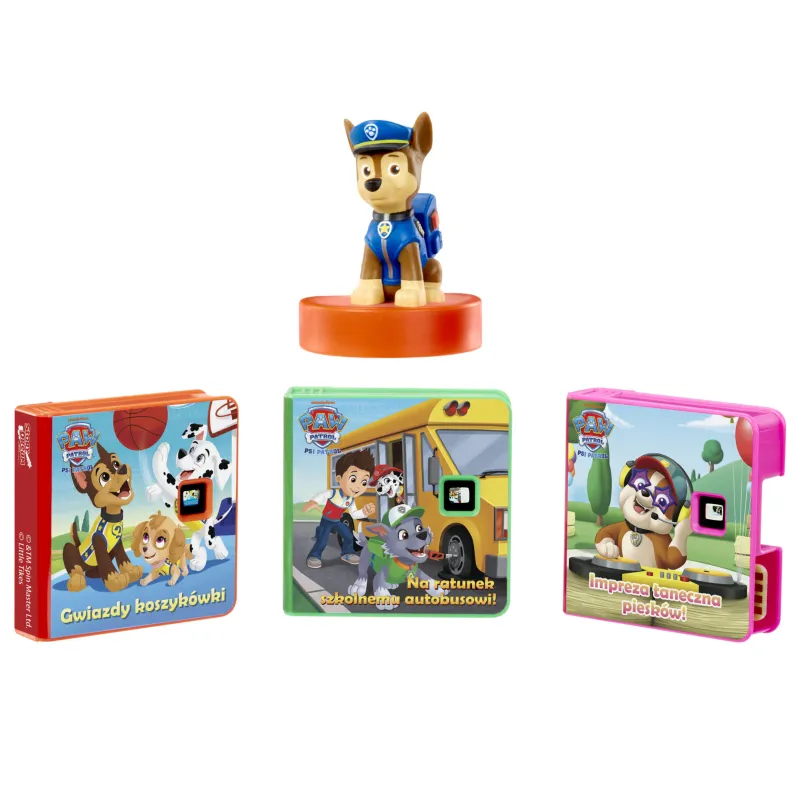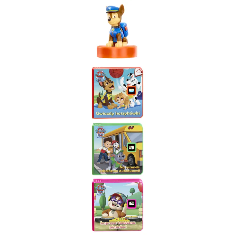 to interaktywny zestaw do nauki i zabawy dla dzieci od 3 lat. Dzięki współpracy z projektorem Dream Machine maluchy mogą oglądać 3 kolorowe historie wyświetlane na ścianie, słuchać narracji i śledzić tekst, rozwijając umiejętność czytania. Efekty dźwiękowe, świetlne oraz figurka Chase’a sprawiają, że każda opowieść staje się wyjątkową przygodą – także przed snem.