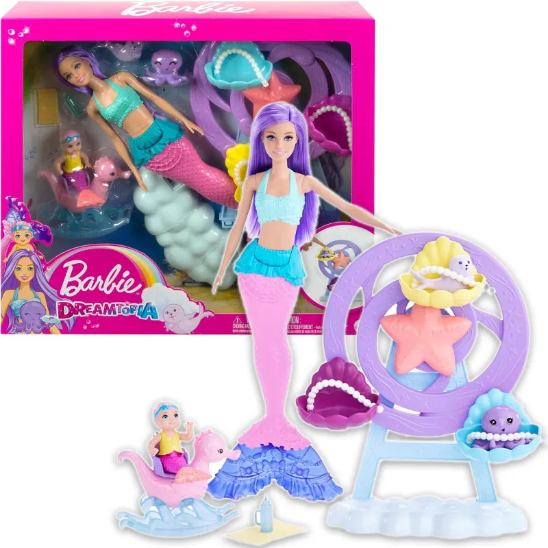 🌟 Barbie Dreamtopia Lalka Syrenka z Diabelskim Młynem 🌟 Przenieś się do magicznego, podwodnego świata Barbie Dreamtopia! Ta urocza syrenka z lawendowymi włosami i kolorowym, błyszczącym ogonem jest gotowa na fantastyczne przygody.