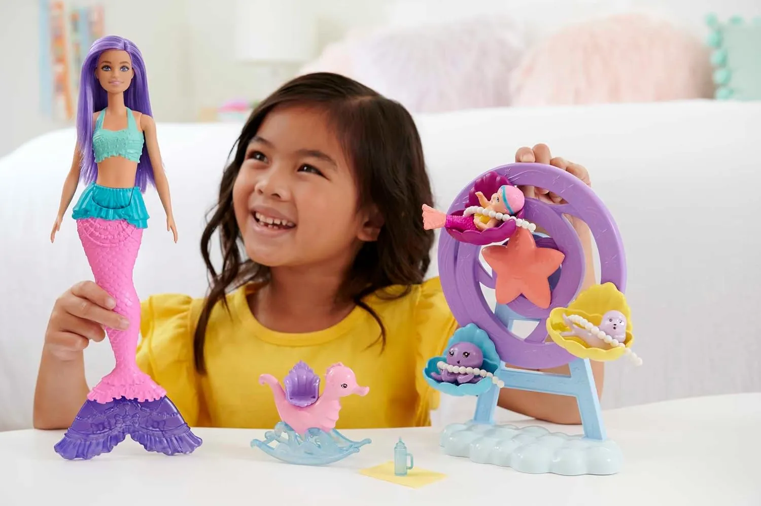 Zestaw zawiera diabelski młyn w kształcie muszli z trzema łóżeczkami, które można kołysać i obracać, a także kołyszącego się konika morskiego, idealnego do uspokajania małych morskich przyjaciół. Dodatkowo w zestawie znajdują się akcesoria takie jak butelka i kocyk, które pozwalają na opiekę nad malutkimi stworzeniami morskimi.