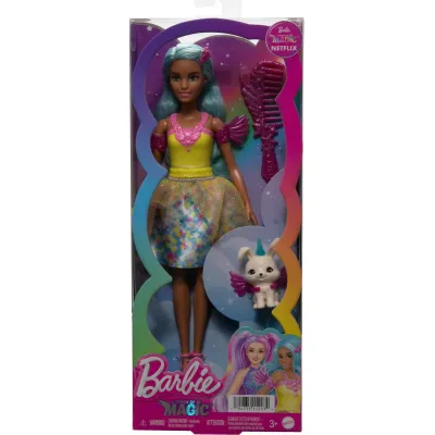 Lalka Teresa inspirowana postacią z serialu Barbie: A Touch of Magic ma błyszczący, fantastyczny strój, turkusowe włosy do czesania i urocze zwierzątko z akcesoriami, co pozwala na kreatywną zabawę pełną magii i przygód