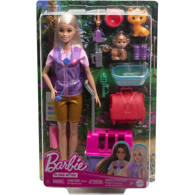 W zestawie znajdziesz lalkę Barbie ubraną w praktyczny strój ratowniczki, dwie urocze figurki zwierząt – małpkę i tygryska – oraz aż 12 akcesoriów takich jak torba weterynarza, skrzynia transportowa, stetoskop, butelka do karmienia, strzykawka, wanna, miska na karmę, szczotka, lornetka, radio komunikacyjne i arkusz naklejek do ozdabiania.