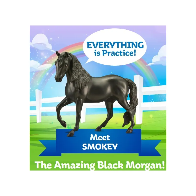Breyer Paddock Pals Koń Smokey 7816 to realistyczna figurka przedstawiająca pięknego czarnego konia rasy Morgan. Smokey jest znany jako mistrz ujeżdżenia – wykonuje polecenia swojego jeźdźca z niezwykłą elegancją, płynnością i naturalnością. Jego motto brzmi: „Wszystko jest kwestią praktyki!”, dlatego razem ze swoim jeźdźcem nieustannie trenuje, aby osiągać coraz lepsze rezultaty.