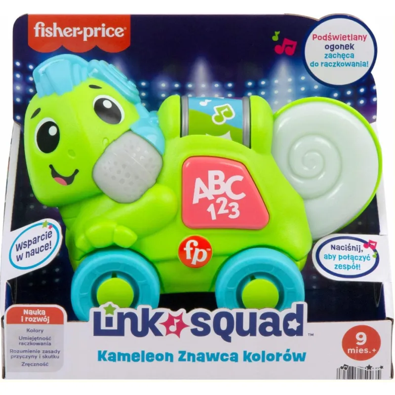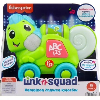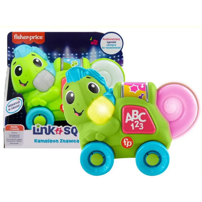 Interaktywny kameleon marki Fisher-Price z serii Link Squad z ponad 25 aktywacjami — zabawnymi dźwiękami, piosenkami i wypowiedziami, które uczą o kolorach i zachęcają malucha do zabawy. Obracanie kolorowego kręciołka lub naciśnięcie przycisku aktywuje muzykę, kolorowe światełka i podświetlający się mikrofon. Zabawka jest w polskiej wersji językowej i została stworzona z myślą o dzieciach od ok. 9 miesięcy – wspiera rozwój sprawności ruchowej i logicznego myślenia podczas zabawy.