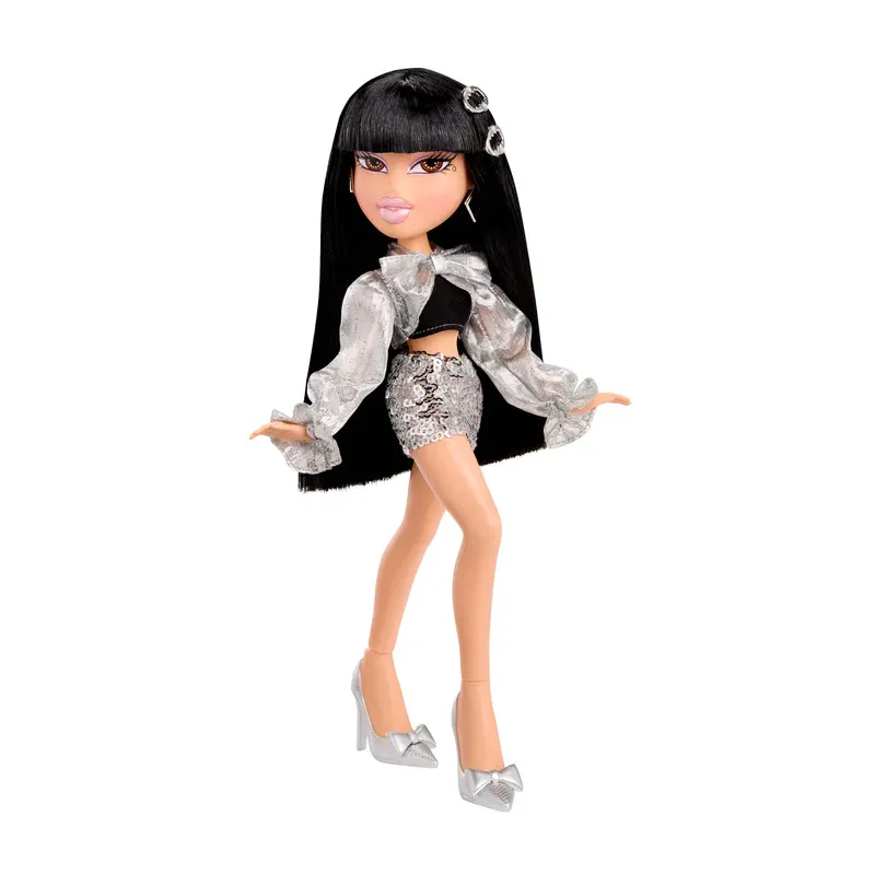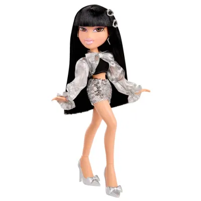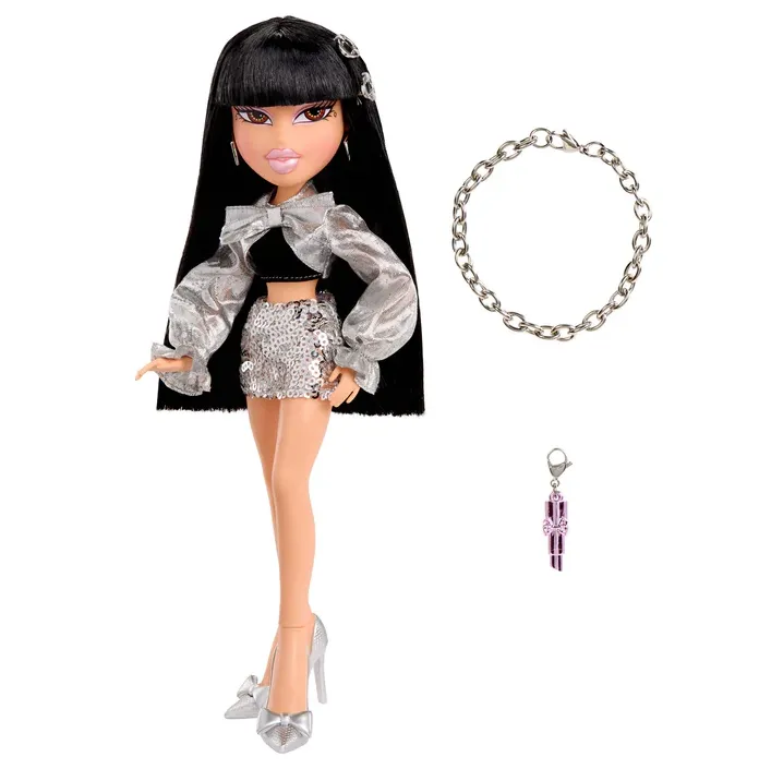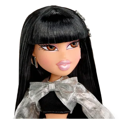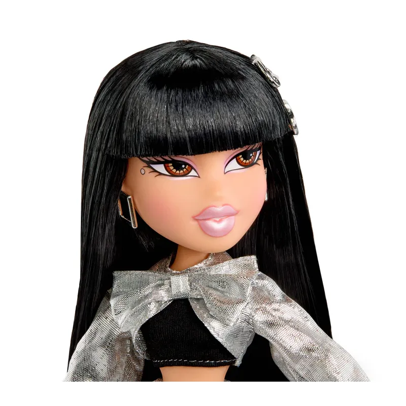 Bratz Charmz Jade to prawdziwa ikona blasku i odwagi w świecie mody. Jej stylizacja przyciąga spojrzenia – chromowana kurtka z oversize’ową kokardą nadaje całości wyrazistego charakteru, a srebrna, brokatowa spódnica dodaje stylowi glamour i futurystycznej energii.
