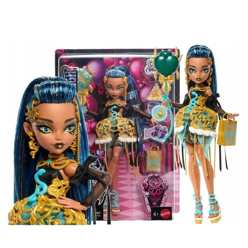 Cleo de Nile z serii Monster High Straszysłodkie Urodziny jest gotowa na potwornie stylową imprezę! Ma na sobie królewską suknię z błyszczącymi detalami, złoty stelaż, efektowne sandały i majestatyczne dodatki. W zestawie także urodzinowe akcesoria: balon, torebka z prezentem i kartka. Idealna dla dzieci i kolekcjonerów!