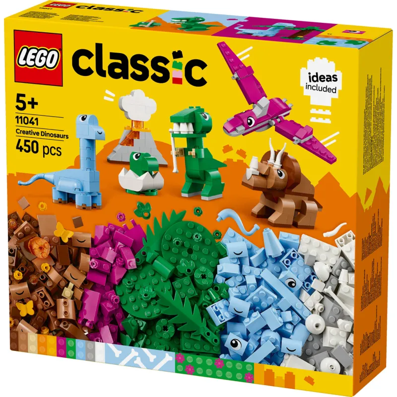 LEGO Classic Kreatywne Dinozaury (11041) 🦖🌿 to zestaw, który przenosi dzieci w prehistoryczny świat dinozaurów, umożliwiając im tworzenie własnych, kolorowych modeli tych fascynujących stworzeń! Zawiera szeroką gamę klocków w różnych kształtach i kolorach, które pozwalają na zbudowanie wielu różnych dinozaurów – od majestatycznego T-Rexa 🦖, przez szybkie velociraptory 🦕, aż po inne prehistoryczne stworzenia.