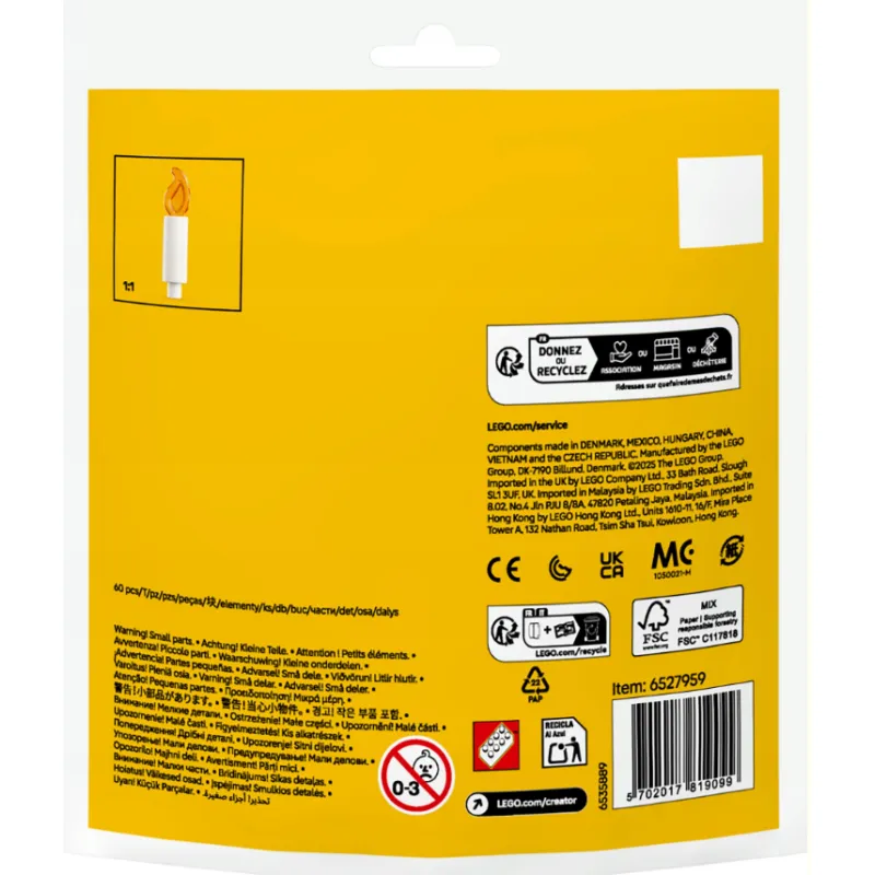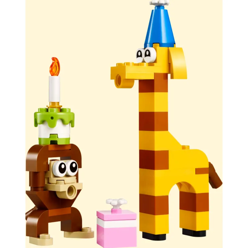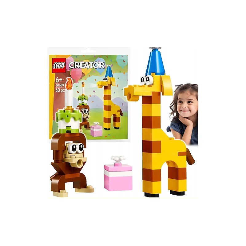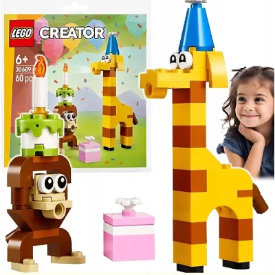 Kolorowy mini zestaw LEGO (60 elementów) z serii Creator, pozwalający zbudować urocze zwierzątka w urodzinowym klimacie – m.in. małpkę z tortem i żyrafę w czapeczce. Idealny jako drobny prezent dla dziecka od 6 lat. Oryginalny produkt LEGO.
