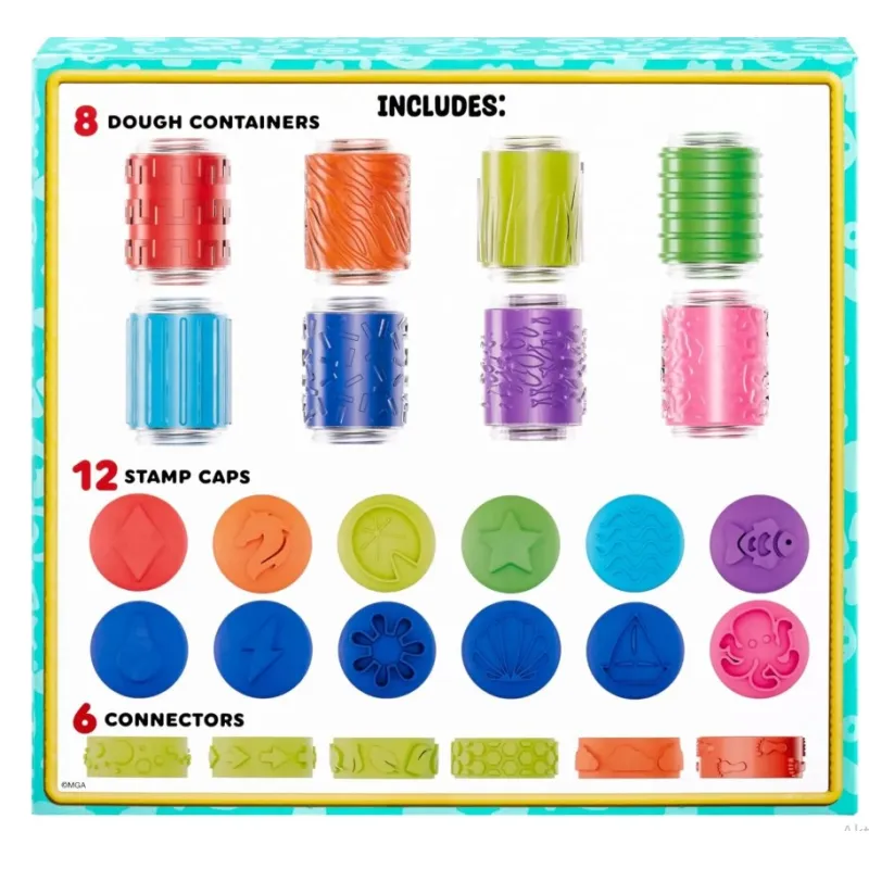 Zestaw Wonder Factory Never Dry Dough Mega Box Set to kompletny pakiet kreatywnej zabawy sensorycznej dla małych artystów. W jego skład wchodzi: - 8 tubek masy o łącznej wadze 456 g, każda w innym kolorze (czerwony, pomarańczowy, zielony, seledynowy, niebieski, granatowy, fioletowy, różowy) - 12 stempli z różnymi wzorami do odciskania w masie - 6 łączników‑rollerów z wypustkami, które służą do wałkowania i tworzenia faktur oraz łączy elementy zabawy