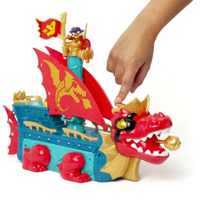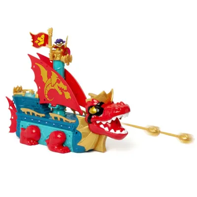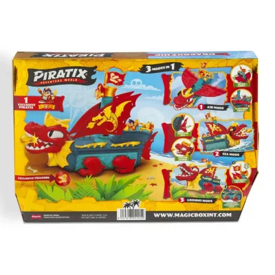 jedyny pojazd Piratix 3 w 1, który porusza się po lądzie, wodzie i w powietrzu! Przemień statek w potężnego smoka, wystrzel ognisty pocisk i wyrusz na poszukiwanie skarbów Jungle Island. W zestawie znajdziesz ekskluzywną figurkę Kapitana Big Reda, monetę transformacji oraz pocisk. Idealny zestaw dla małych piratów spragnionych przygód!