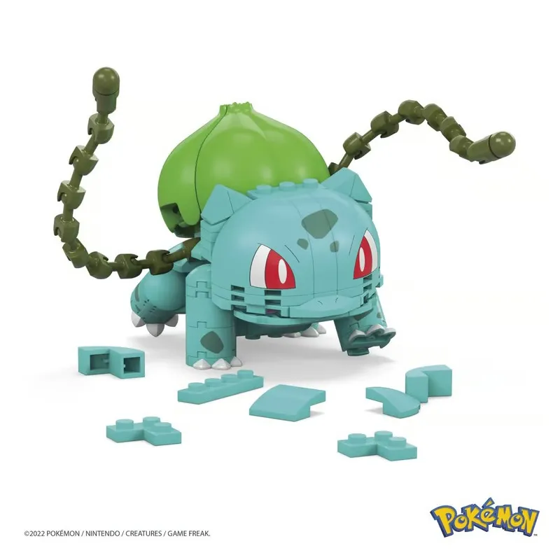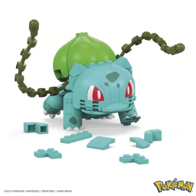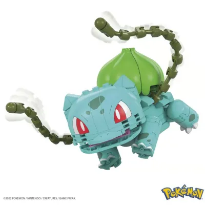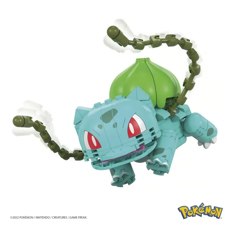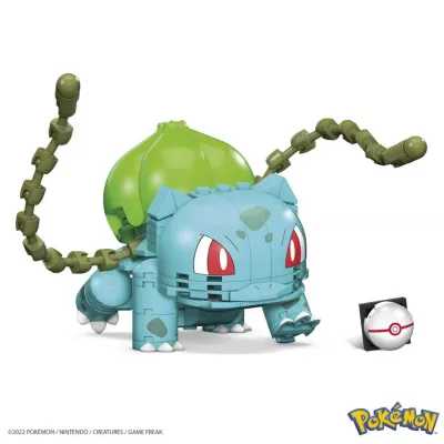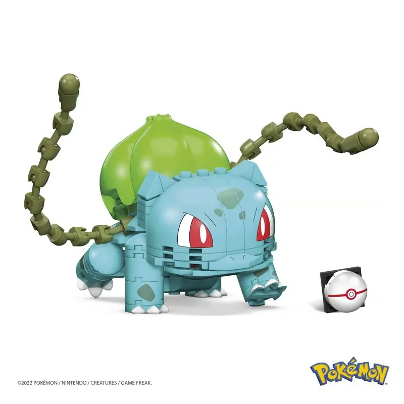 Ten trawiasty stworek o spokojnym usposobieniu przypomina niebieskiego żółwia z zieloną bulwą na grzbiecie, z której wyrastają pnącza – i właśnie te detale można odwzorować dzięki starannie zaprojektowanym klockom. Ruchome elementy (pnącza) dodają zabawie dynamiki, a do zestawu dołączono także charakterystyczny biało-czerwony Pokeball.