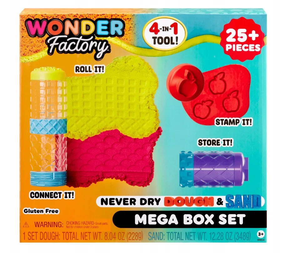 MGA Wonder Factory - Masa plastyczna Never Dry Dough & Sand Zestaw MEGA BOX to świetny zestaw do kreatywnej zabawy, który pozwala dzieciom tworzyć i eksperymentować z różnymi materiałami. Masa nie wysycha, więc można się nią bawić przez długi czas!