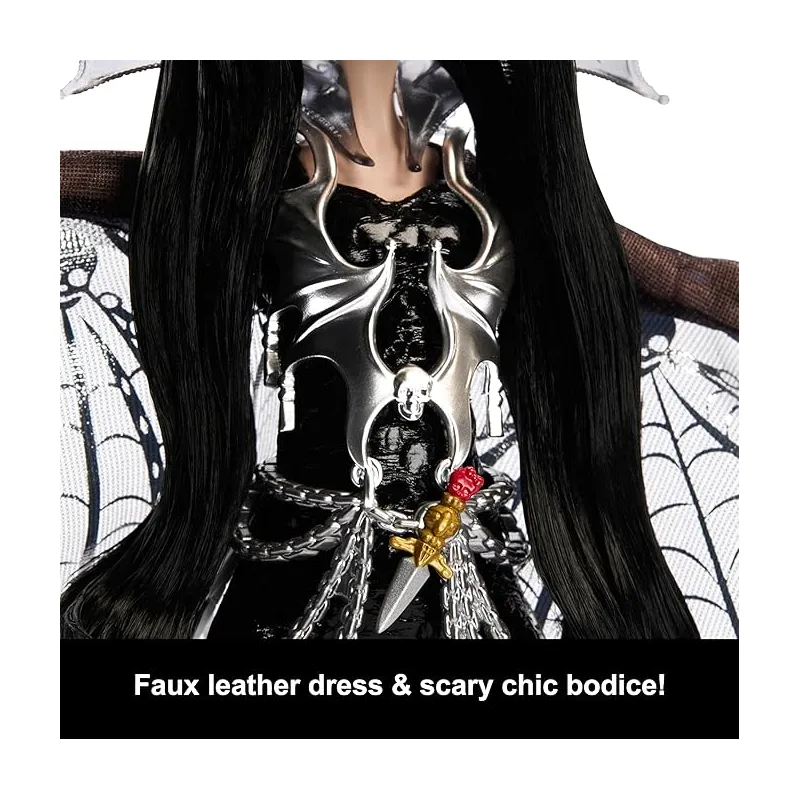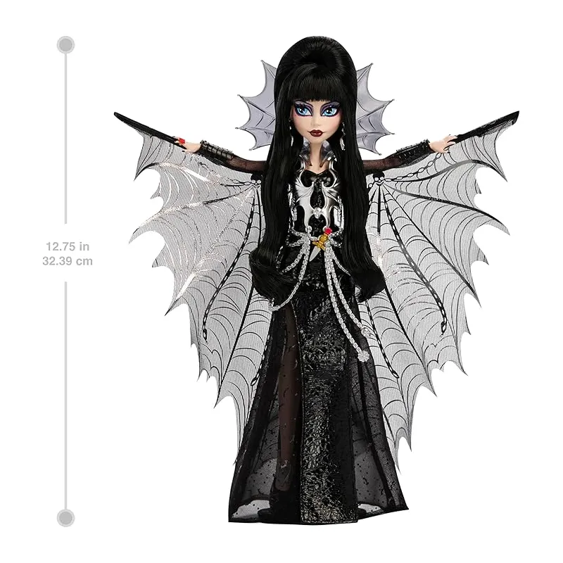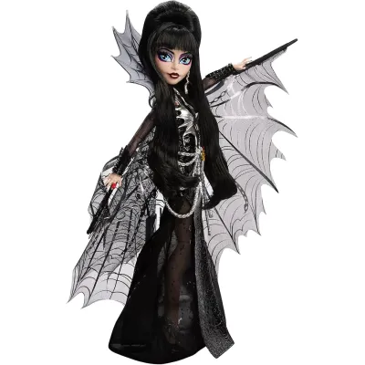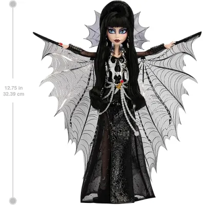 Całość dopełnia upiorna biżuteria: pierścień z czerwonym oczkiem i kolczyki w kształcie węża, dodające charakteru i tajemniczości. Lalka zapakowana jest w luksusowe opakowanie inspirowane słynnym Macabre Mobile – samochodem Elviry, co czyni ją prawdziwą perełką dla kolekcjonerów.