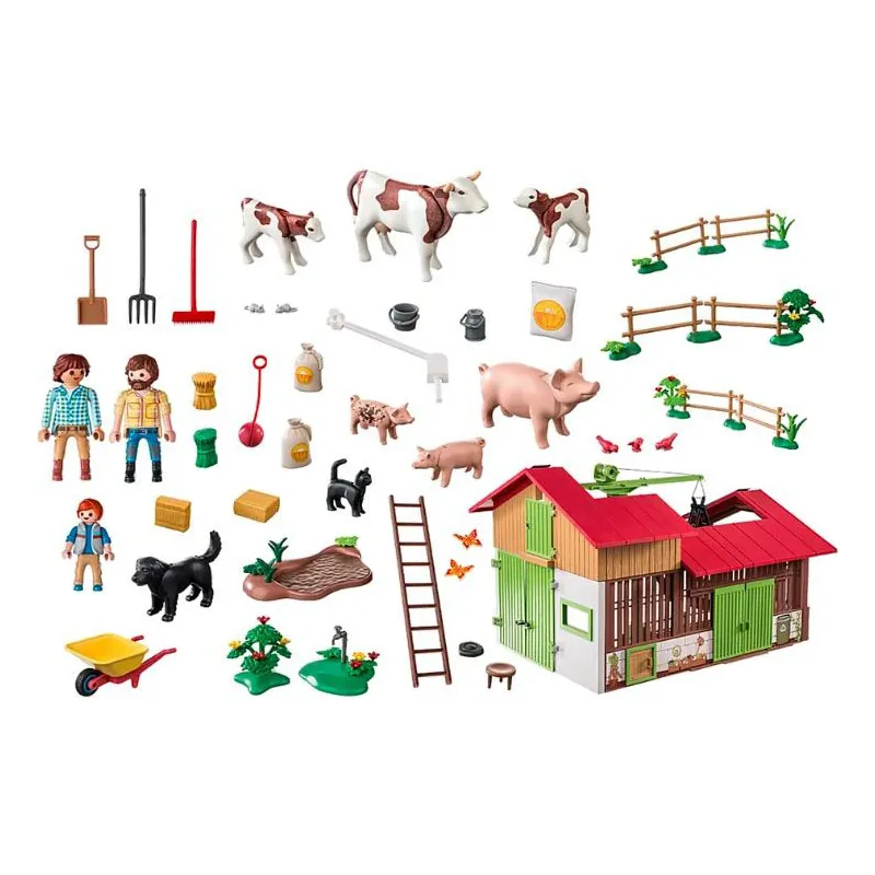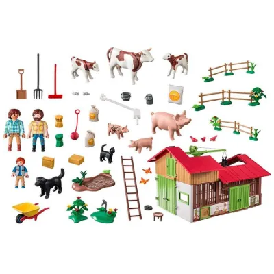 to rozbudowana farma z 182 elementami, która pozwala dzieciom odkrywać fascynujący świat rolnictwa. W komplecie znajdują się figurki rolników, zwierzęta gospodarskie oraz liczne akcesoria do pracy na farmie. Funkcjonalna stodoła z otwieraną bramą i działającą wciągarką sprawia, że zabawa w świecie Playmobil jest jeszcze bardziej realistyczna i kreatywna.