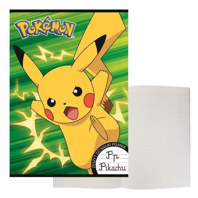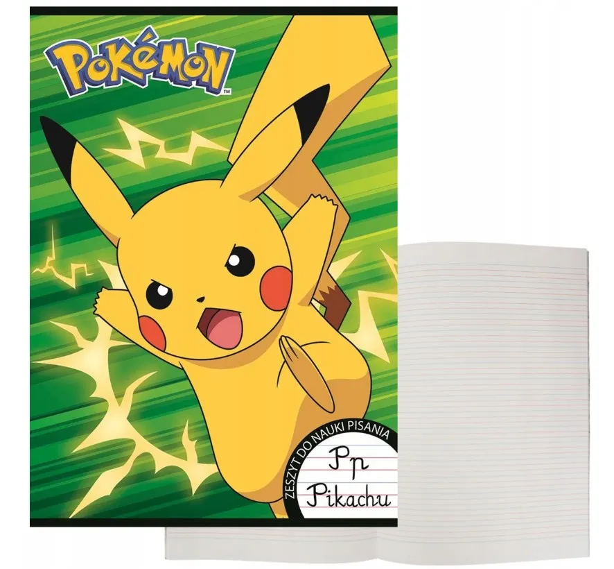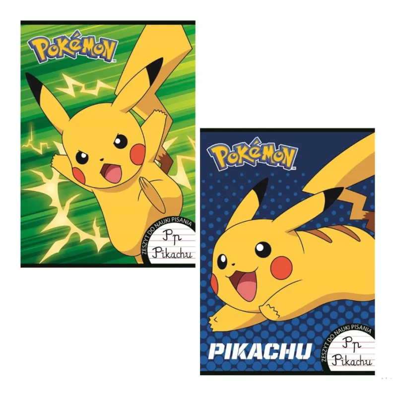 Zeszyt do nauki pisania Pokemon A4, 32 kartki w podwójnej linii kolorowej, to połączenie wysokiej jakości papieru, estetycznego wykończenia i nowoczesnego designu. Okładkę zdobi motyw z Pikachu na zielonym lub niebieskim tle, a całość uzupełnia wewnętrzny zadruk i wkładka adresowa.