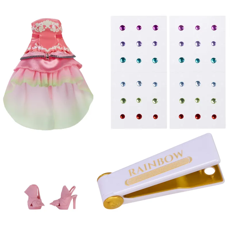 to wyjątkowa lalka z kolekcji Be Dazzling, która łączy modę z kreatywną zabawą. Vivienne Rouge zachwyca czerwonymi włosami i efektownym strojem, który można ozdobić dołączonymi kryształowymi, tęczowymi naklejkami oraz aplikatorem do personalizacji. Lalka jest w pełni artykułowana, co pozwala na realistyczne pozowanie, a zestaw zawiera dodatkowe akcesoria, by stworzyć własny, błyszczący look. Idealna dla młodych projektantów mody i kolekcjonerów pragnących skompletować całą drużynę Rainbow High.