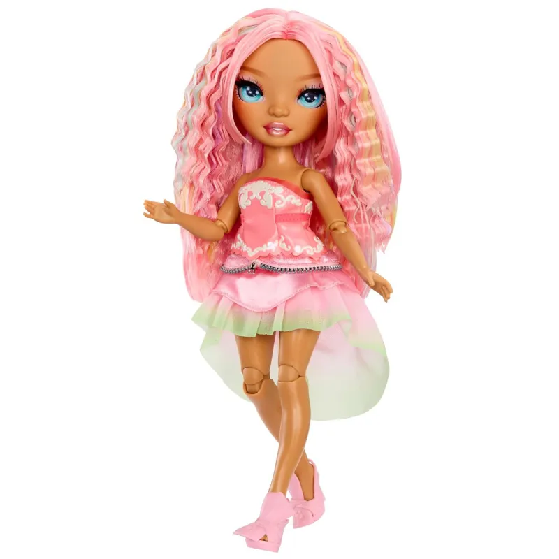 Lalka modowa Rainbow High Be Dazzling Adeline Rose to wyjątkowa bohaterka, która wnosi do kolekcji subtelny różowy styl, paryski szyk i romantyczny charakter. Inspirowana spacerami po paryskich domach mody, zachwyca elegancką stylizacją nawiązującą do świata haute couture. Lalka wyróżnia się długimi, lśniącymi włosami, realistycznymi rzęsami oraz błyszczącymi oczami, które nadają jej wyjątkowo stylowy wygląd.