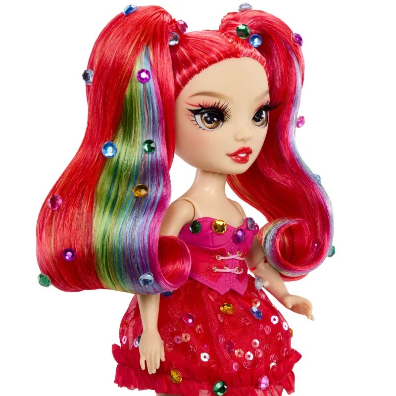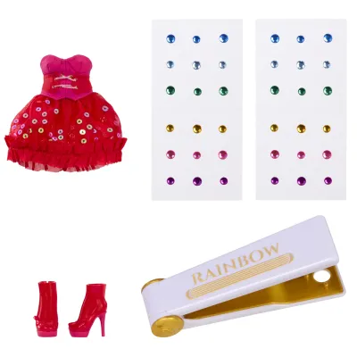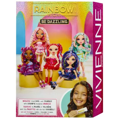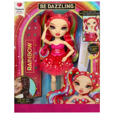 to wyjątkowa lalka z kolekcji Be Dazzling, która łączy modę z kreatywną zabawą. Vivienne Rouge zachwyca czerwonymi włosami i efektownym strojem, który można ozdobić dołączonymi kryształowymi, tęczowymi naklejkami oraz aplikatorem do personalizacji. Lalka jest w pełni artykułowana, co pozwala na realistyczne pozowanie, a zestaw zawiera dodatkowe akcesoria, by stworzyć własny, błyszczący look. Idealna dla młodych projektantów mody i kolekcjonerów pragnących skompletować całą drużynę Rainbow High.