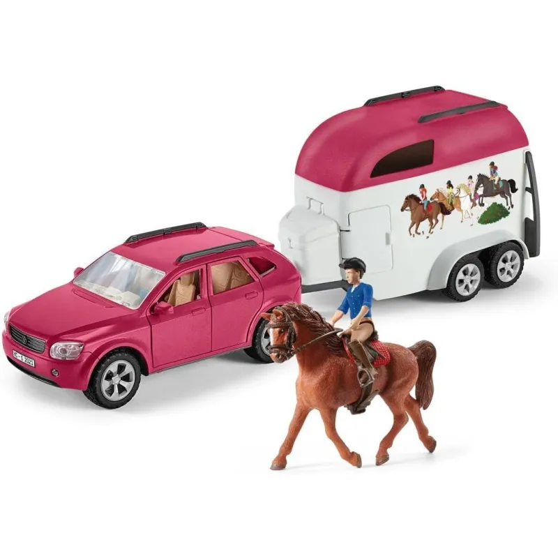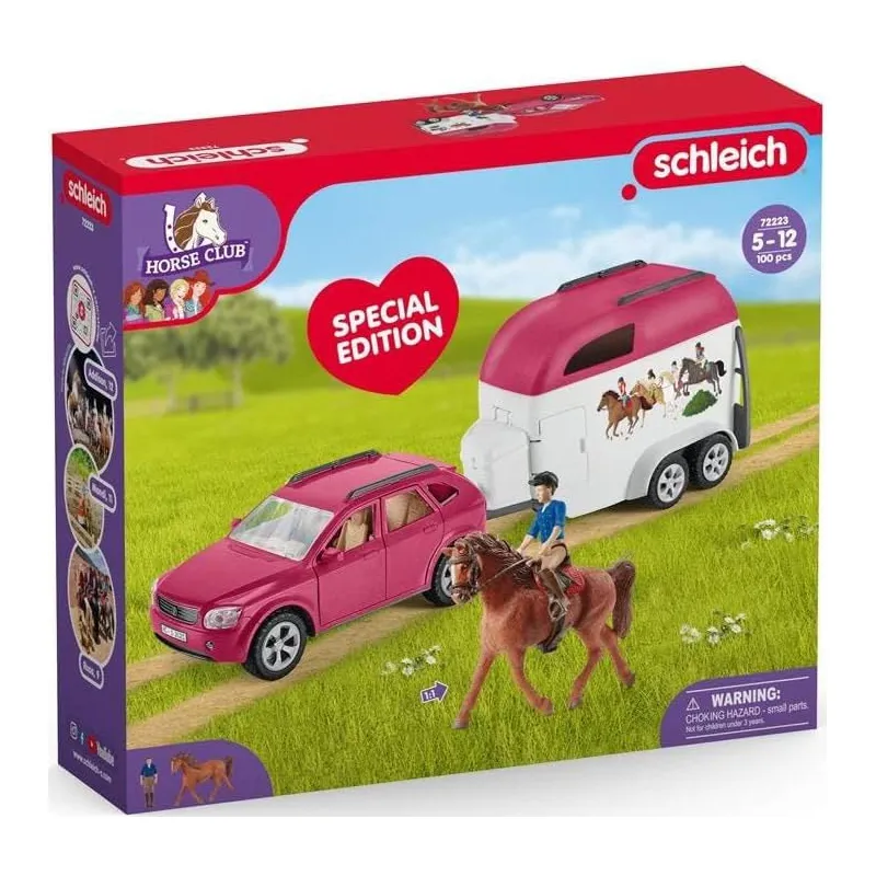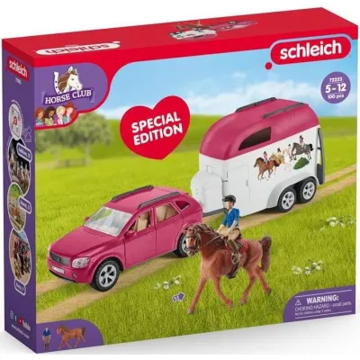 Schleich Samochód z Przyczepą Horse Club 14668 to idealny zestaw dla dzieci, które kochają konie i marzą o własnej stadninie. W zestawie znajduje się solidny samochód typu SUV w kolorze różowym oraz przyczepa do przewozu koni, co pozwala na realistyczną zabawę w transport zwierząt na zawody, do stajni czy na pastwisko. Pojazd ma rozkładane siedzenia i miejsce na akcesoria, a przyczepa została wyposażona w opuszczaną rampę, która ułatwia załadunek konia.