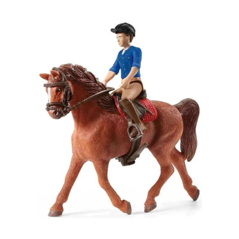 W komplecie znajdują się również figurki dziewczynki Hanny, jej taty oraz pięknej klaczy holsztyńskiej. Postacie mają ruchome ręce i nogi, dzięki czemu można je posadzić w samochodzie lub ustawić w różnych pozycjach podczas zabawy. Dodatkowe akcesoria, takie jak siodło, uzda, wiadro, szczotki i hełm jeździecki, umożliwiają odgrywanie scenek związanych z opieką nad koniem i przygotowaniami do jazdy.
