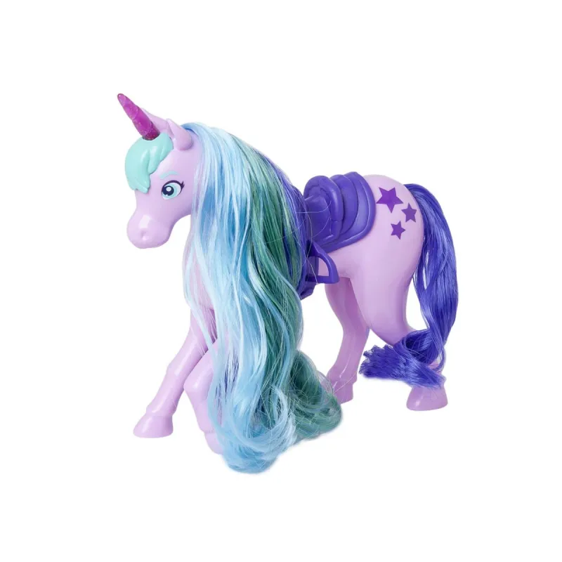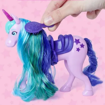 Jednorożec wyróżnia się piękną grzywą wykonaną z prawdziwych włosów, którą można czesać i stylizować przy pomocy dołączonej szczotki.
